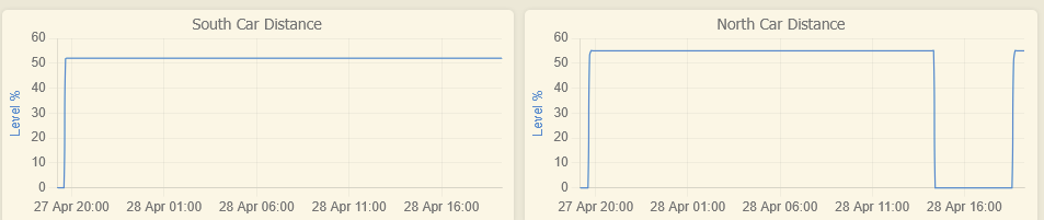 I use the Watchtower app to track the Level parameter for both sensors starting last night. The North car left today for a few hours. Here's the trace: