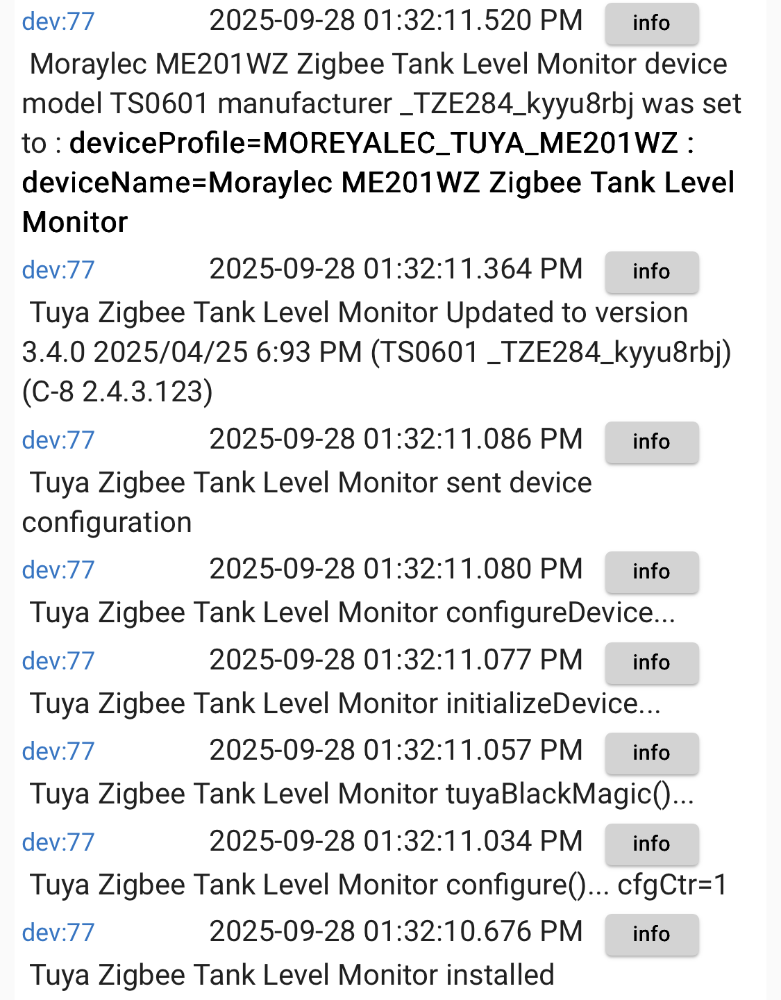 I just paired up one of the Tuya tank level monitors and ran into a problem: I can't set the "installationHeight" to any non-zero value -- I type 2.9 (my garage ceiling height in meters; I'm going to use these as automobile "presence" detectors) and the number changes to 0.0 as soon as I move the cursor out of the data field. Details of my Device Data below.