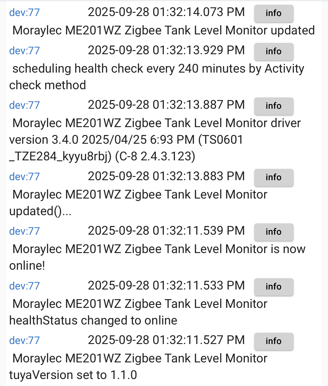 The liquidDepth reading on both of my garage ceiling ultrasonic transducers* would bounce between 2 close values (e.g., 1.52 and 1.53). The new update from Krassimir Kossev reduces the excessive logging for that problem