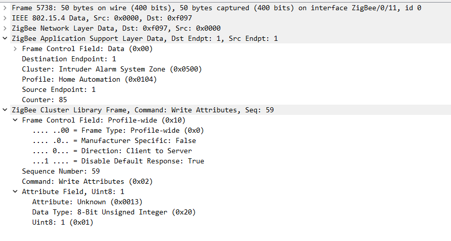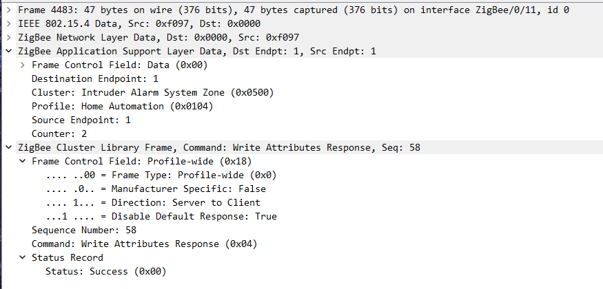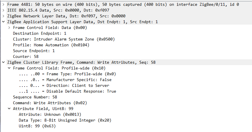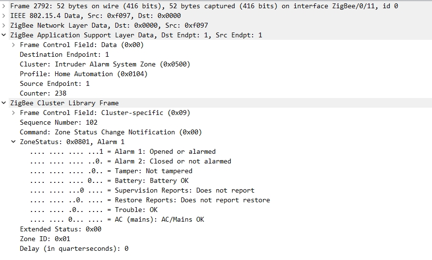 This is a packet when the sensor detects vibration. Specifically the ZoneStatus: 0x0401, Alarm 1