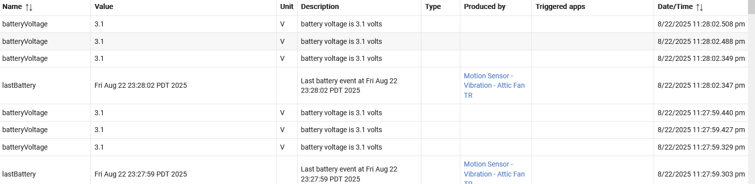 healthStatus online healthStatus changed to online Motion Sensor - Vibration - Attic Fan TR