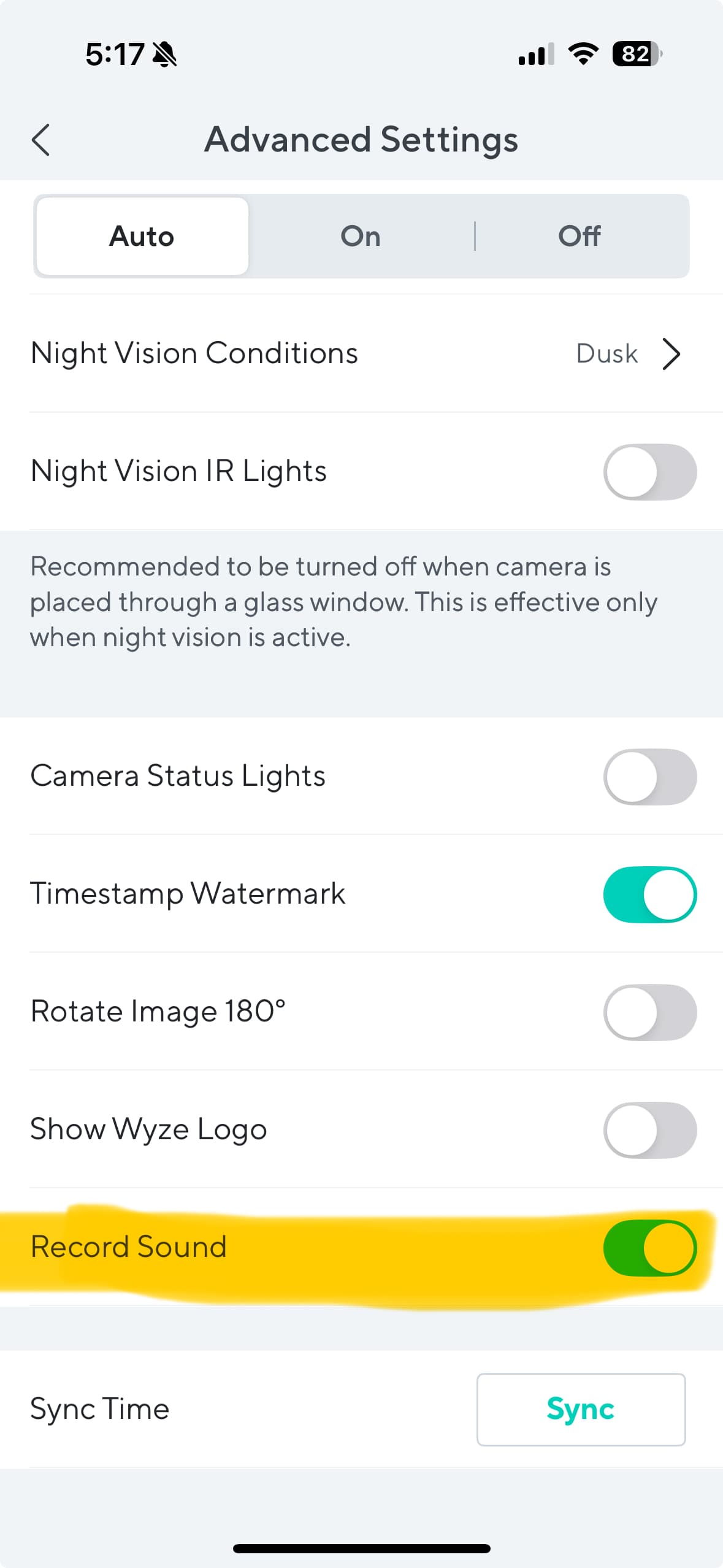 I don't want to turn the camera on or off, just change a setting as to whether or not sound is recorded when a monitoring event happens. Here is where the setting is in the WYZE app