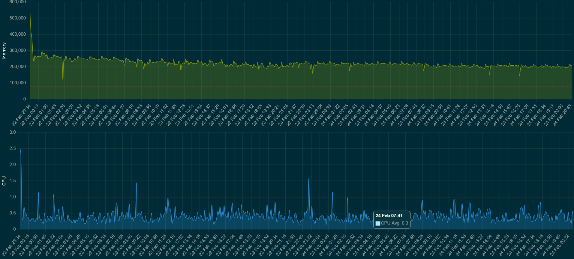 I think that everything above 1 is bad, as in proceses are not executed immediately and are put in a queue because the CPU is busy doing something else. That's why I added the red dotted threshold line at 1.0.
