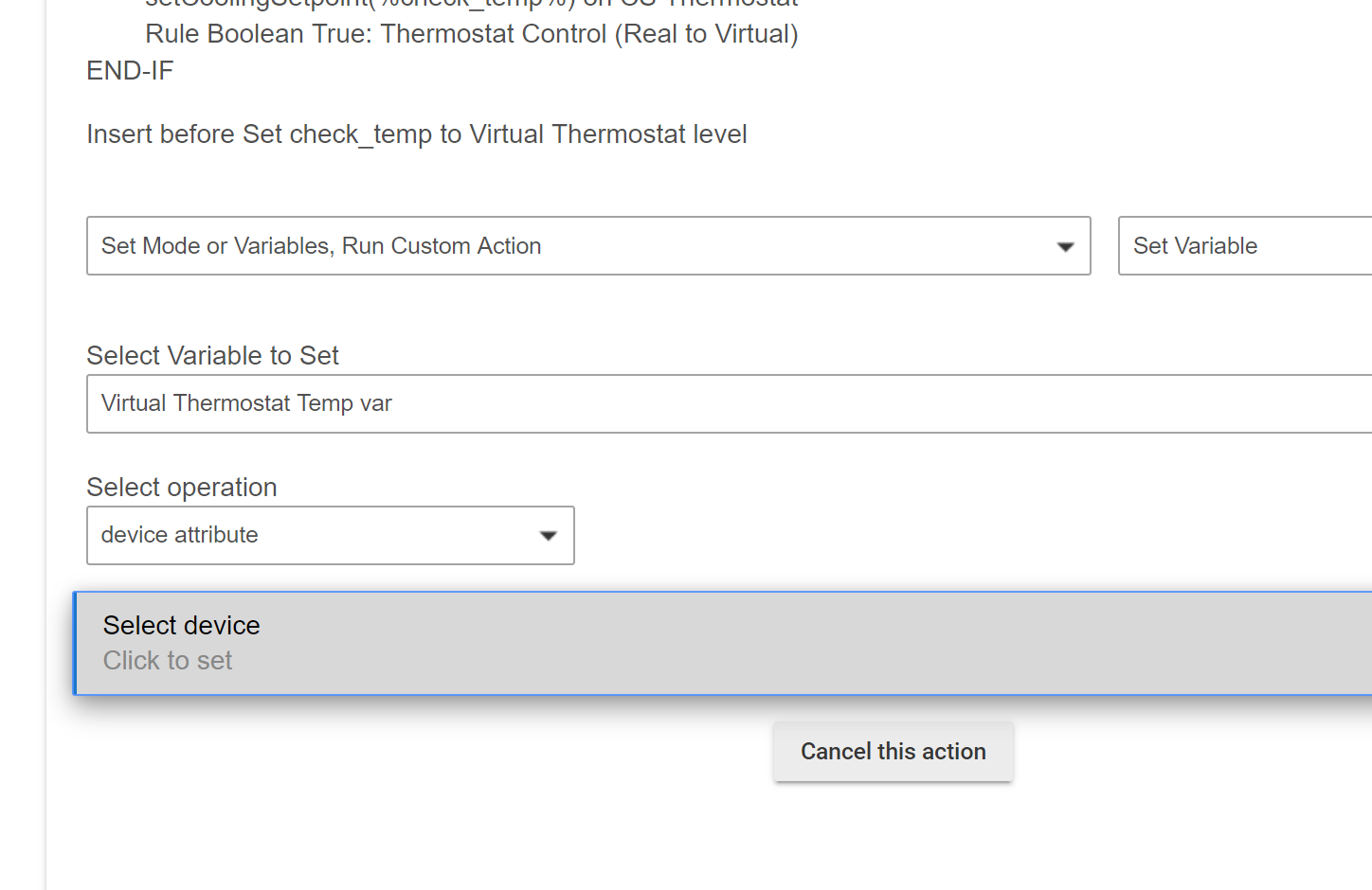 You can see in the last screenshot, that when I've tried to use a global variable, the only reaction when clicking the "Select device" dialogue box is that it gets a blue shadow. If I choose a local variable from the first list, then this works just fine. My virtual-to-real and real-to-virtual thermostat control works fairly well. Other than the odd behavior of the Zen thermostat in general. It tends to bounce around a lot, and require multiple setpoint pushes to ensure reliability. I did a repeat-actions loop to hit it a few times just to make sure.