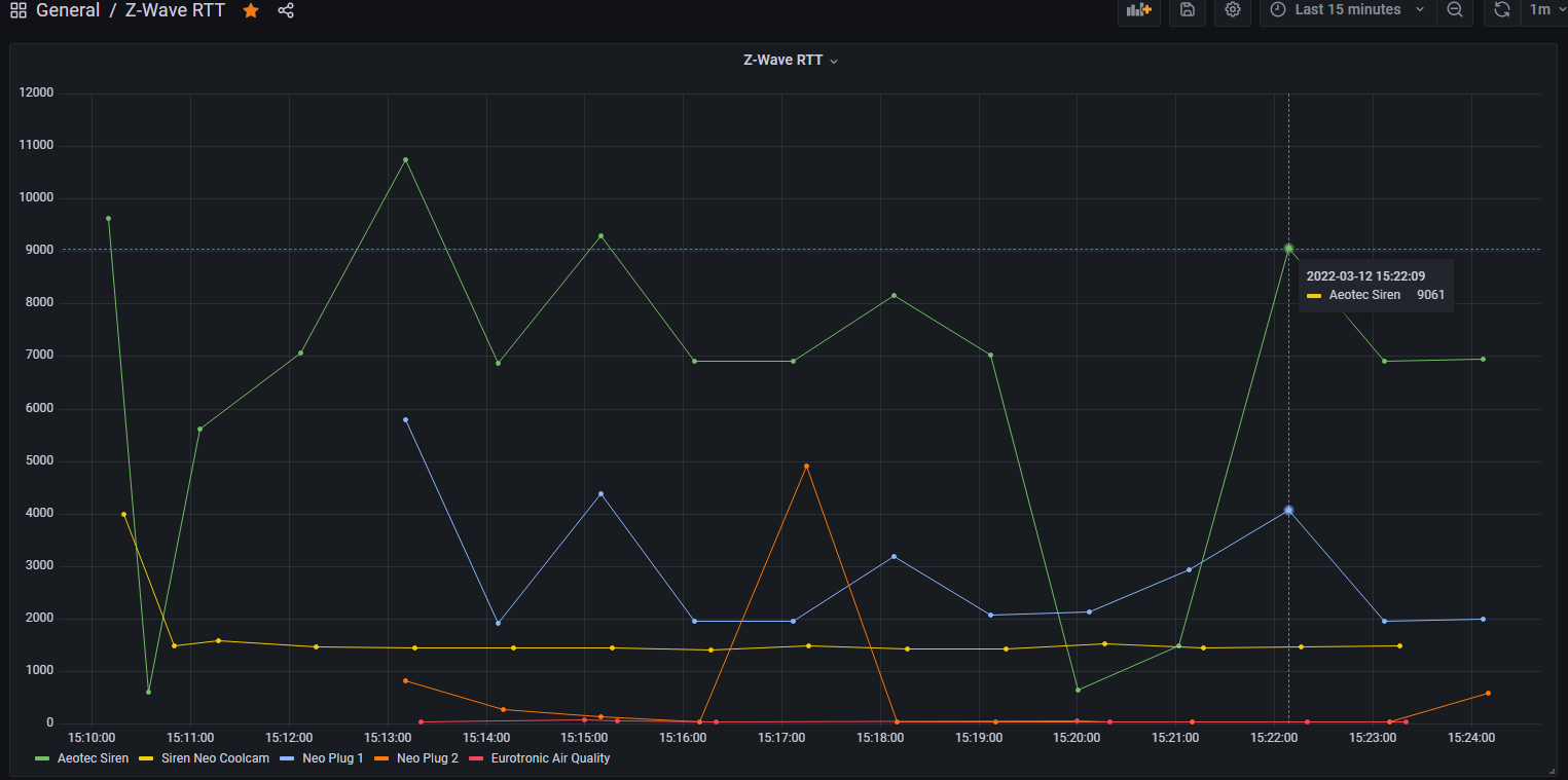 I have started collecting the RTT measurements data. I have not changed anything in my test z-wave devices setup for now, these are the results from the existing configuration.
