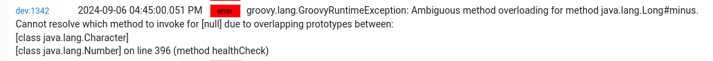 dev:13422024-09-10 03:00:00.105 PMerrorgroovy.lang.GroovyRuntimeException: Ambiguous method overloading for method java.lang.Long#minus.