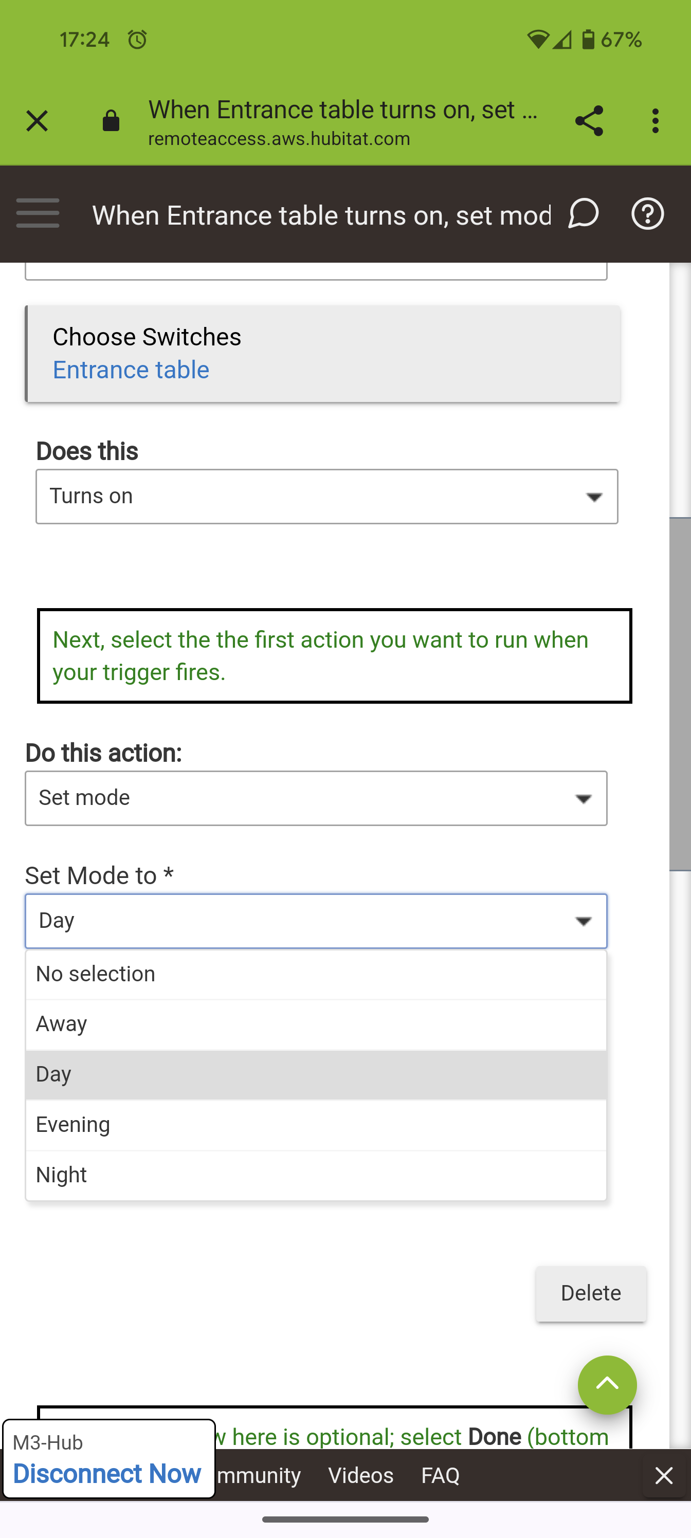 I'm using an entrance table lamp switch to designate if I'm away. The switch is OFF= away, the switch is ON I'm home or not away. In the app for switch ON I must select between day, evening or night. How can I tell the hub to select the correct mode when reverting to not away.