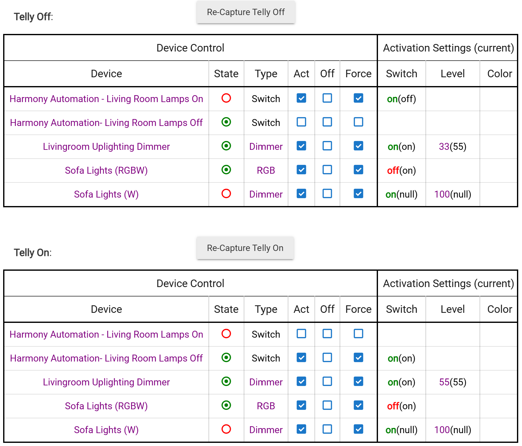 So, the system is changing my living room lights based on mode correctly; the system is turning the lights on correctly when the telly is off (including telling the Harmony Hub to turn on its lights); the system is mostly setting the correct lighting when the telly turns on but is failing to command the Harmony Hub to turn off its lights.