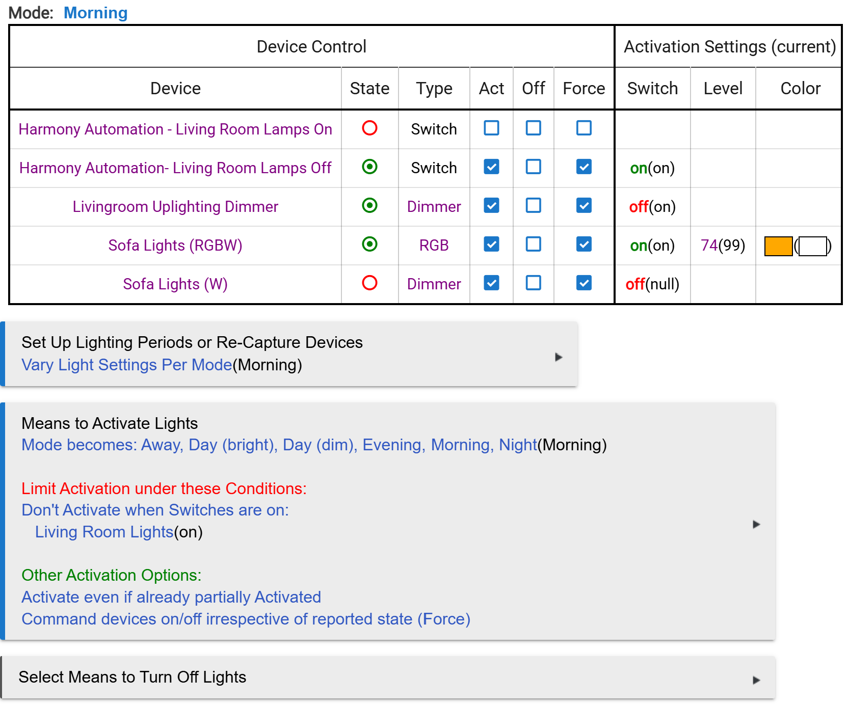 In the morning mode, the living room remains dark and the sofa lighting is coloured to indicate morning mode. When a motion sensor detects me moving, and the illumination is below a threshold and the telly is off, then the living room lights turn on to the 'Telly off' state. This involves some light strips, a dimmer and a command to my Logitech Harmony for certain bulbs it has associated (my first foray into home automation was with the Zigbee/Z-Wave extender to Harmony Hub).
