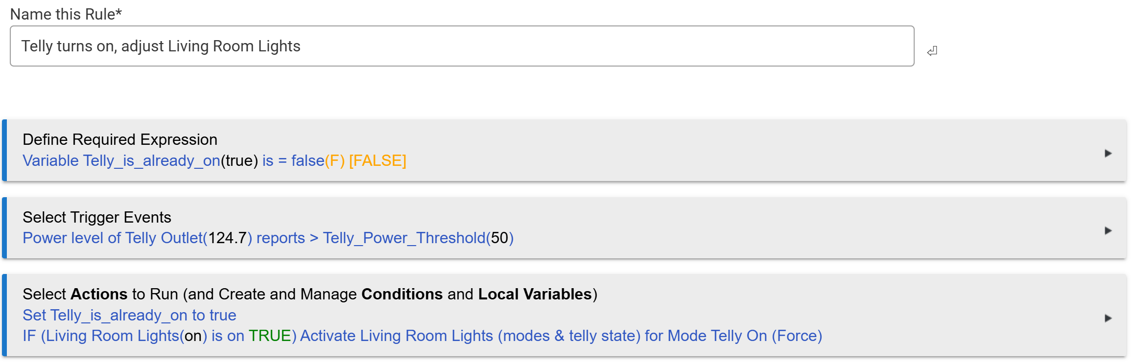 Then I turn my telly on and the rule I have set up confirms the change and forces the other telly-based lighting to change the brightness on certain lights and issue the command to turn off the Harmony Hub lights (to avoid reflections on the telly screen).