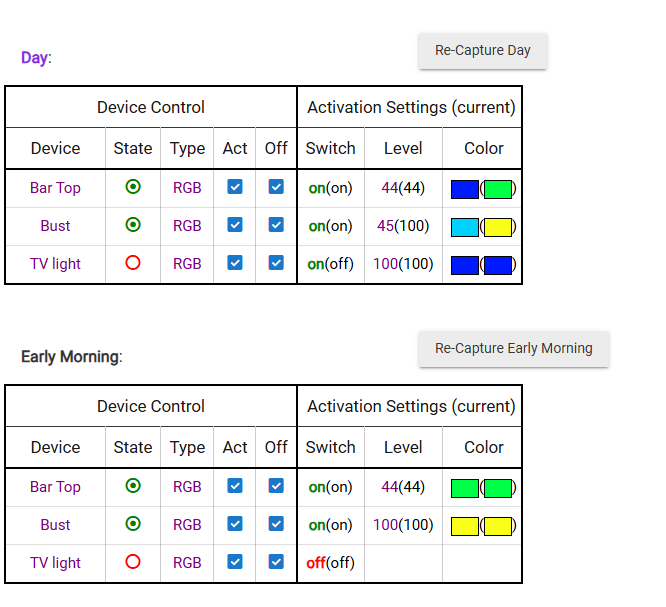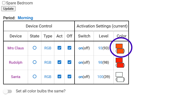 What you have circled looks ok (other than them not next to each other). That just says that the bulb is currently set to orange and the Morning setting is orange. If you chang the bulb to green it should show green as current and orange as the Morning setting.