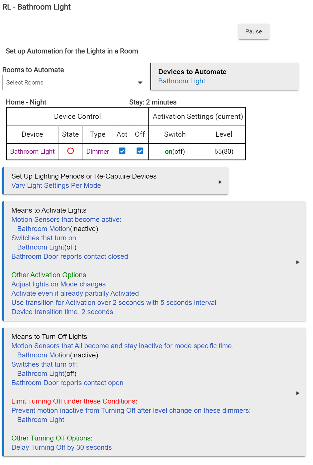 Also with Bathroom Door reports contact open on the Means to Turn Off it will turn the light off as soon as the door is open. You may not want that. The 30 seconds will probably cover it. You can fine tune from here but you should be close.