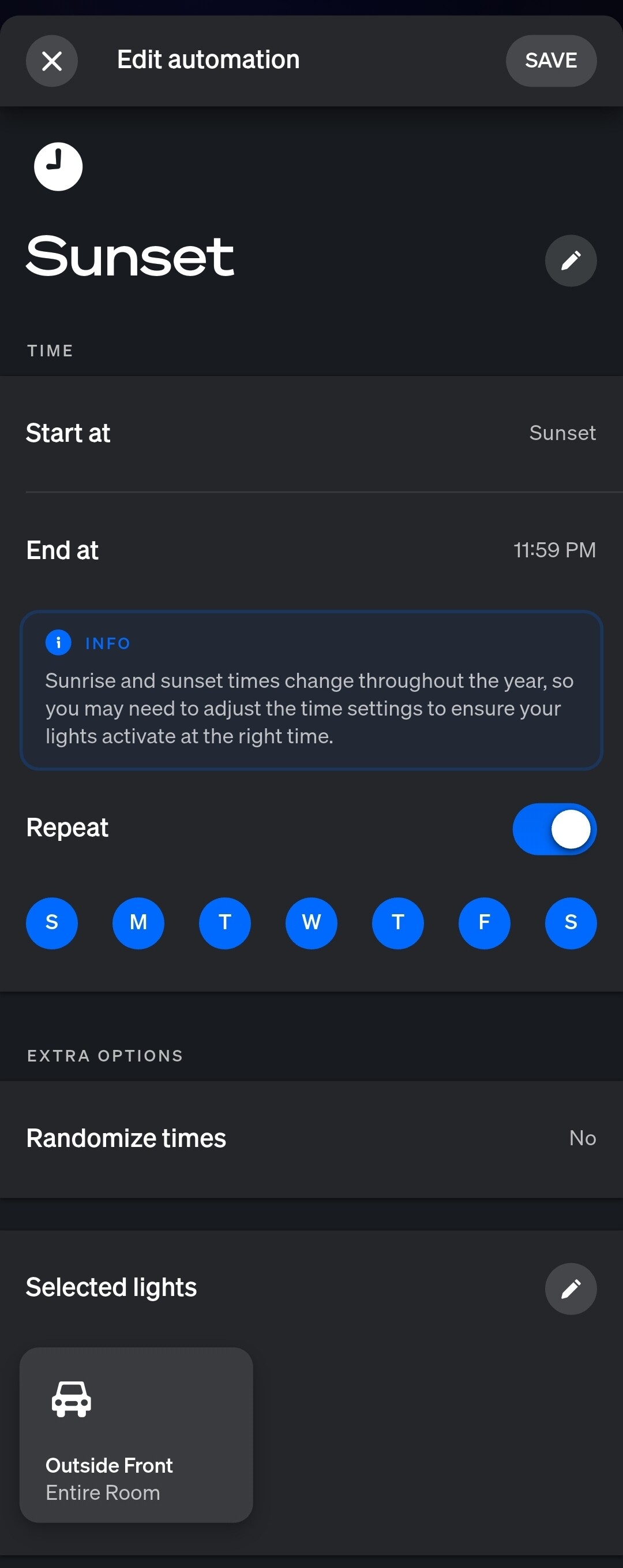 I have a Hue automation that turns them on at sunset with a color scheme using the "outdoor front" Hue room.