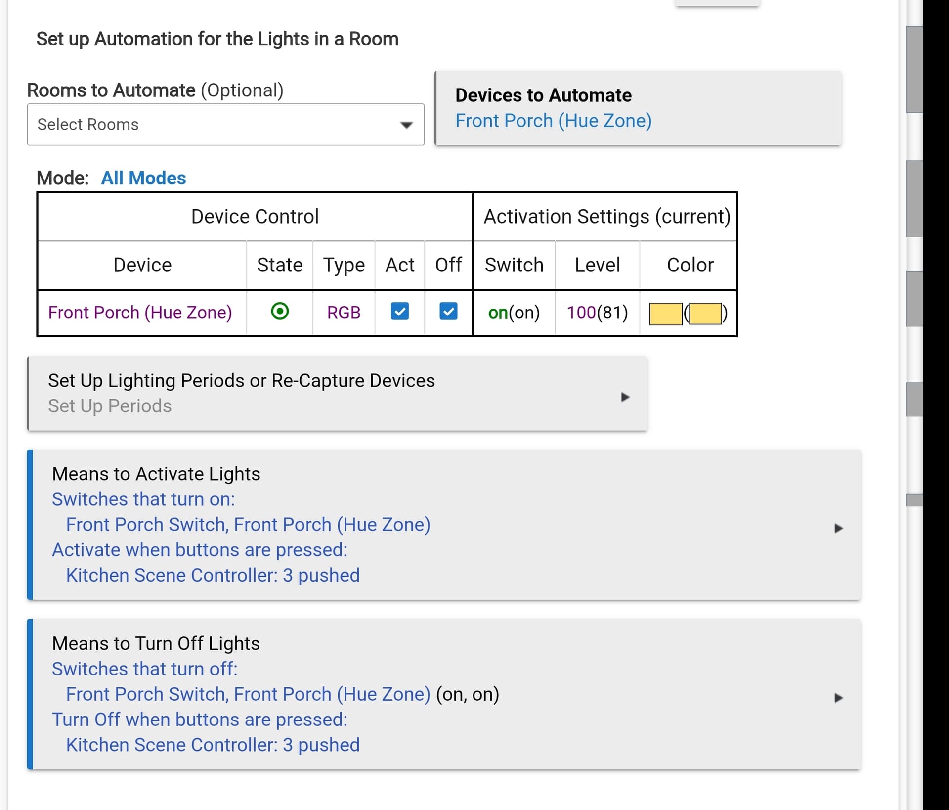 But the other problem is when the Hue scene has turned them on, if I go into the Hue app and turn them off, the smart switches don't work right. I have to click the smart switch off then on again. I think it's because Room Lighting isn't recognizing that Hue turned them off? Not sure how to fix this. Here's how RL is setup for the front porch.