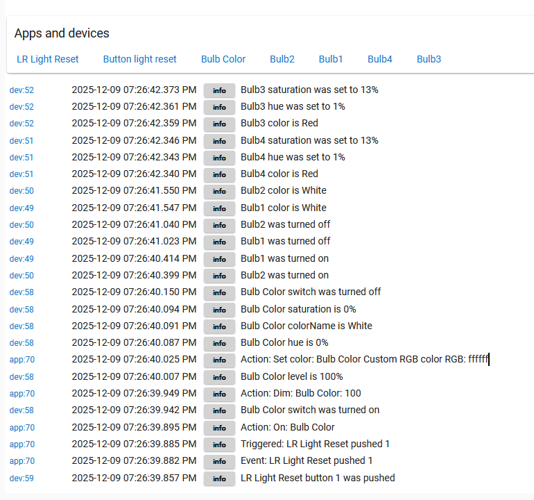 What is going on here? I also tried this rule in webCoRE and i got the same odd results any time i added the action to change the bulb color as part of the rule. If I manual change the color to the bulb group, it executes fine and the individual bulbs change to the correct color.