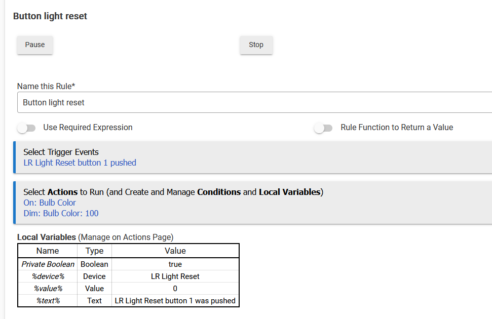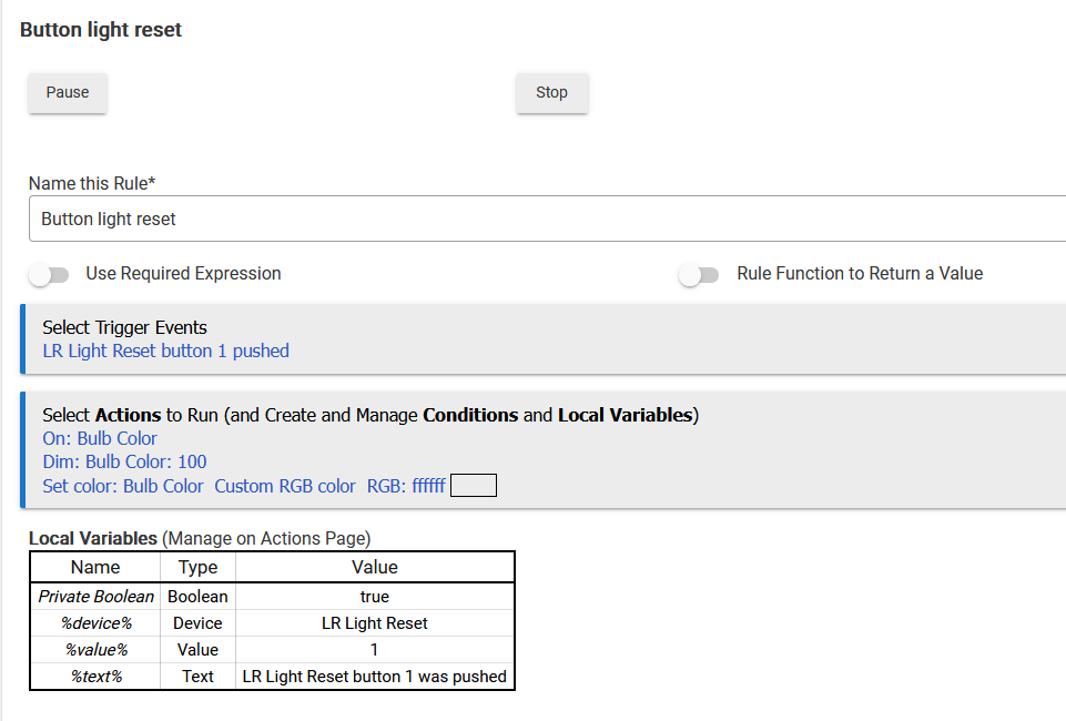 I created a rule to reset my lights to on, color to white and full brightness when I press a button.