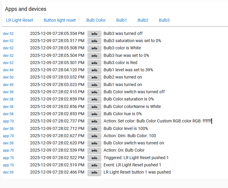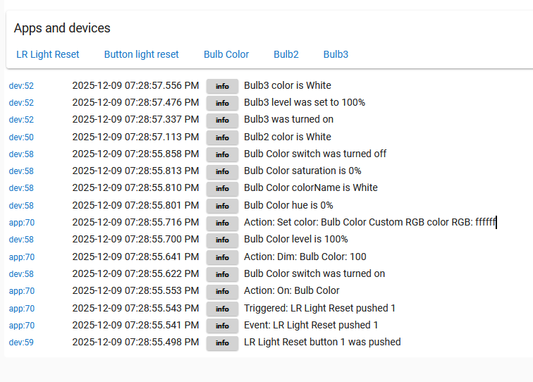 In summary, that would basically mean replacing all of your actions with just a "Set color temperature" (or "Set color" with a properly formatted color value if you really want an RGB color instead -- but that would not be my suggestion for white). Provide logs, ideally filtered to just the rule and a single device that demonstrates the problem and a description of what happens, if that doesn't help. Thanks!