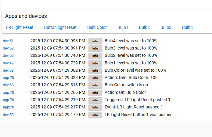 The rule only calls the bulb group (Bulb Color) and that should update the individual bulbs. However, when I click the button, it does all sorts of actions i didn't ask for. I pressed the button 4 different times and each time it did a different set of random actions to the individual bulbs.