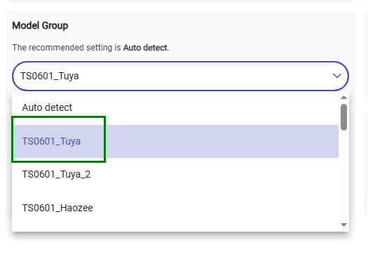 In the Preferences tab, select 'Model Group' TS0601_Tuya and click on Save :