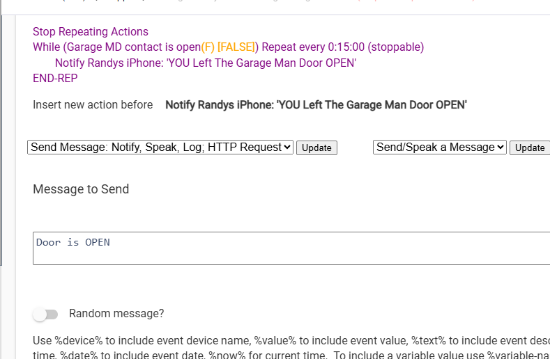 Try your version of this. The door is left open for 15 min. The loop starts notifying you. Re-notified every 15 min the door stays open. The Stop Repeating is so the while does not stack up but makes a new one for each trigger.
