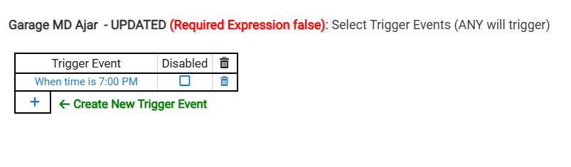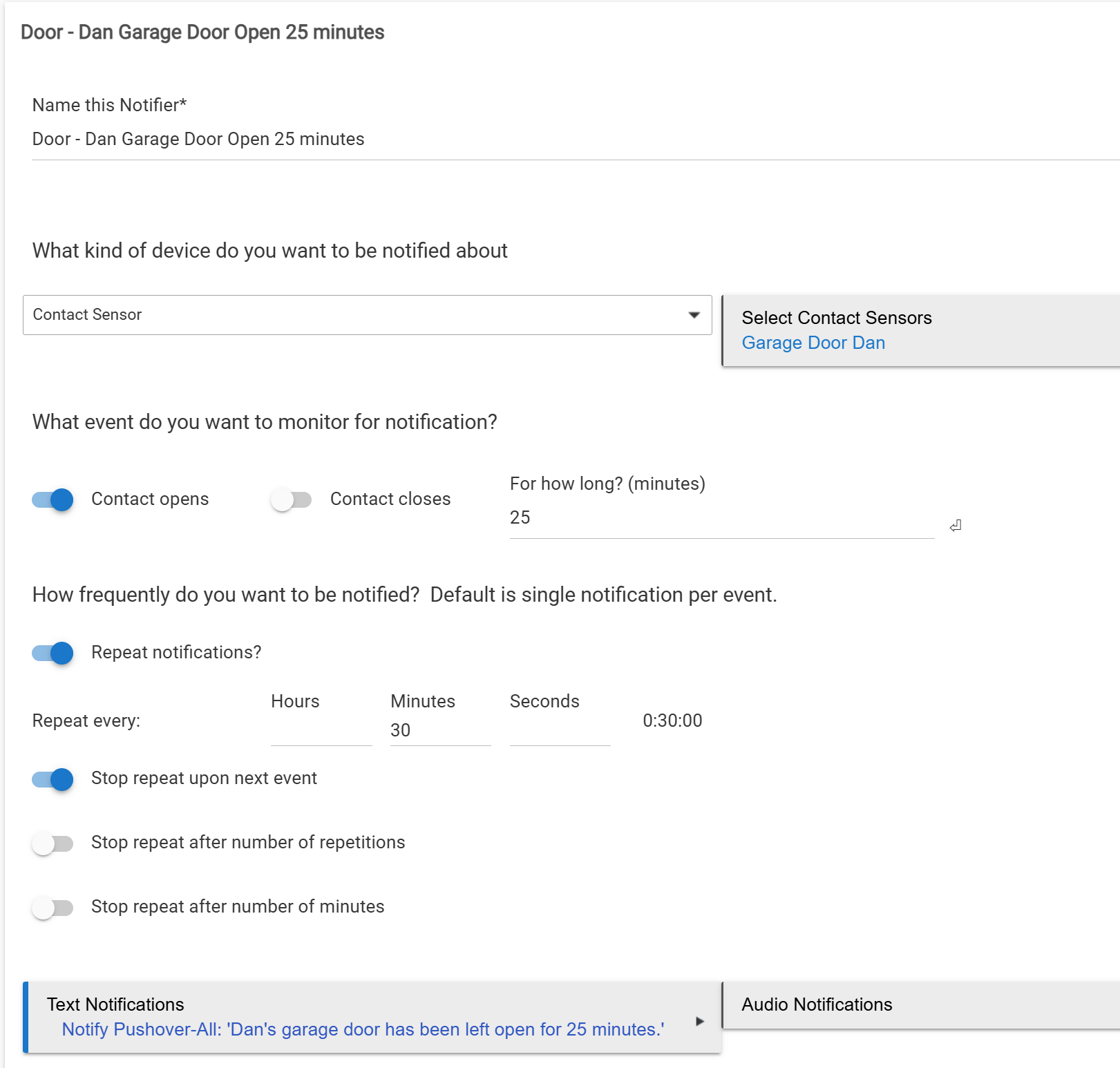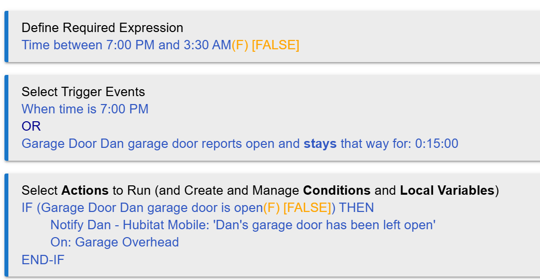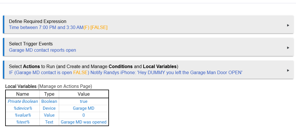This rule doesn't notify you if you leave the garage door open; it notifies you when you open the garage door and it happens to be between 7 PM and 3:30 AM.