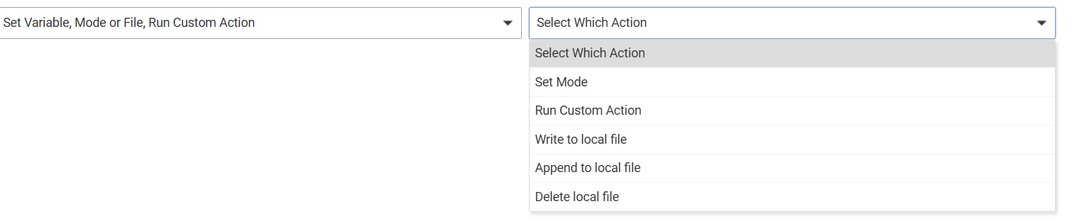 Perhaps posting a screen shot of the options available for the "Select custom command" control when you select "Set Variable, Mode or File, Run Custom Action" would help the community see what's available to you.