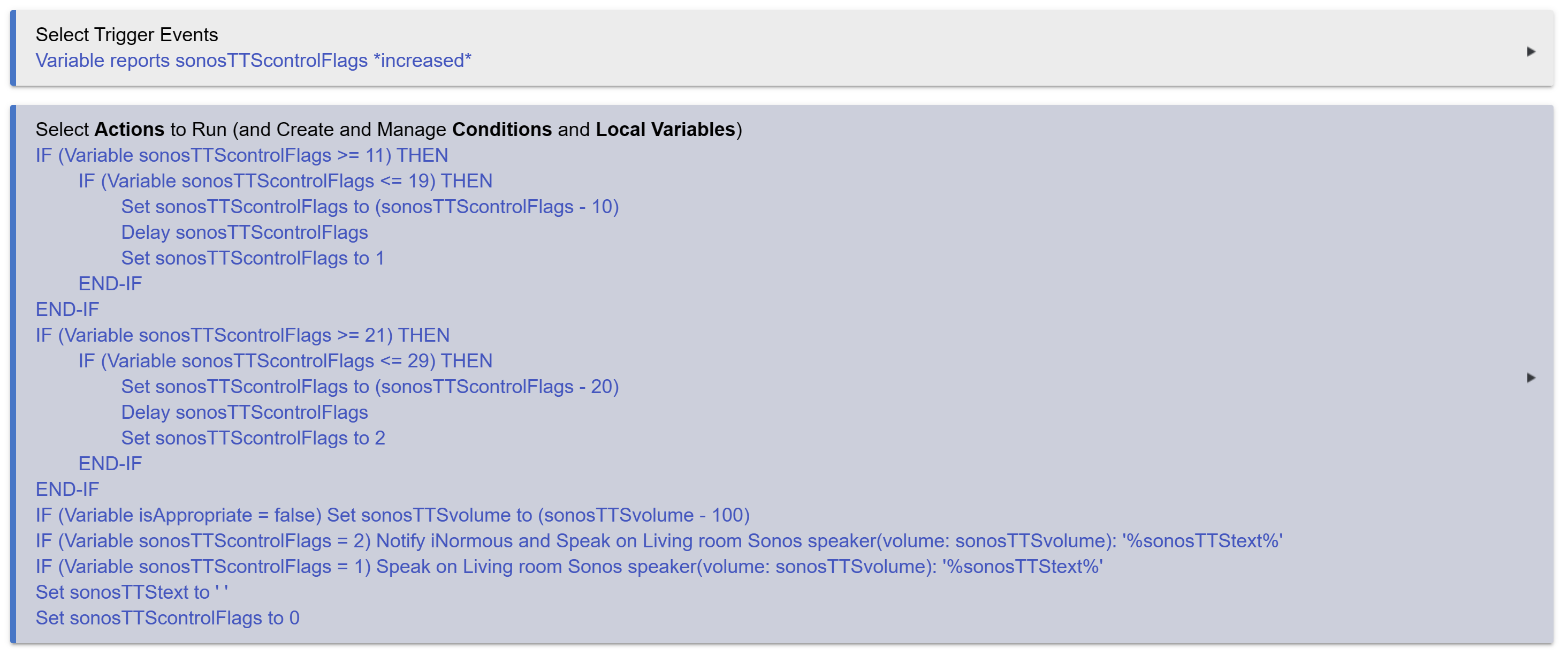 I can't fathom what string would end up with a value of '22'--that's the controlFlags variable but that's always been of type 'number'. The only string involved here is the sonosTTStext string which isn't part of the equation (literally and figuratively). All variables were global prior to my mod below.