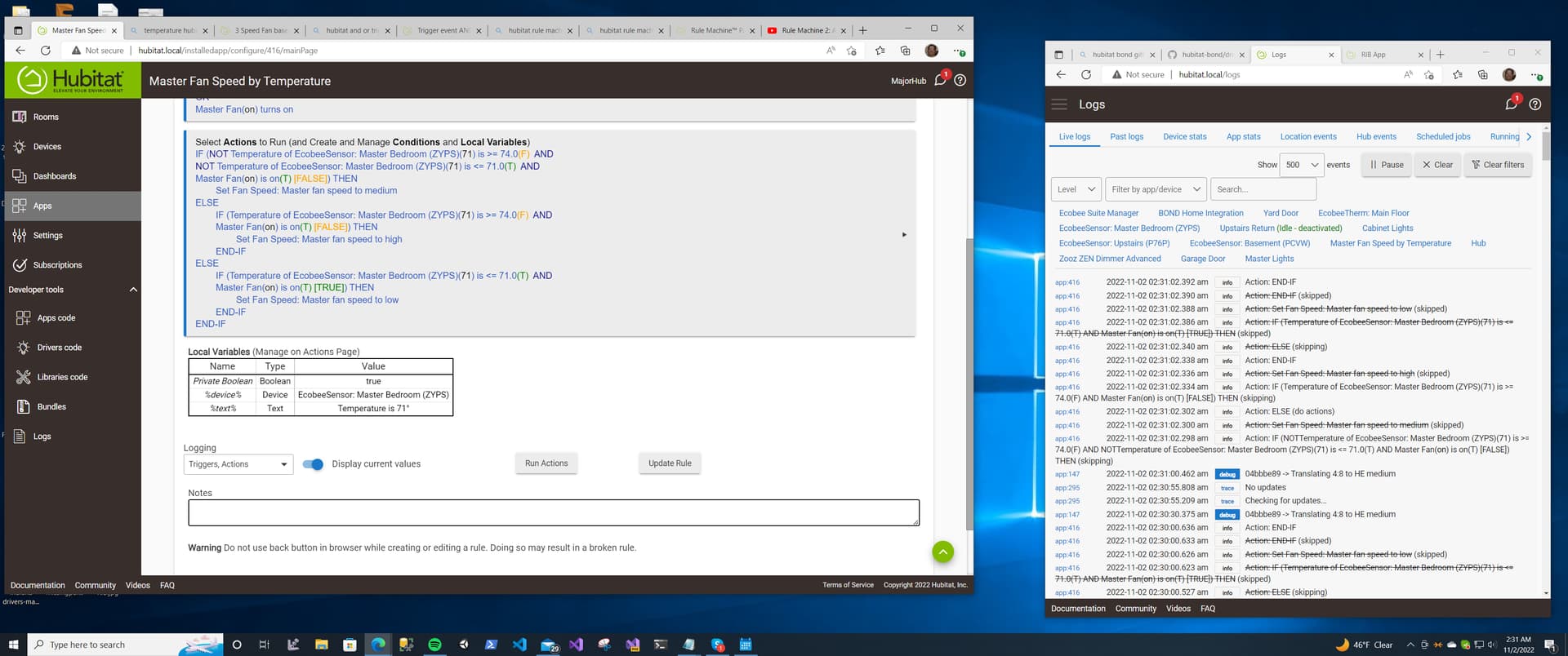 The rule in the editor correctly evaluates the last condition as true, but in the logs it shows it is not executing the "THEN" Fan speed set to low.