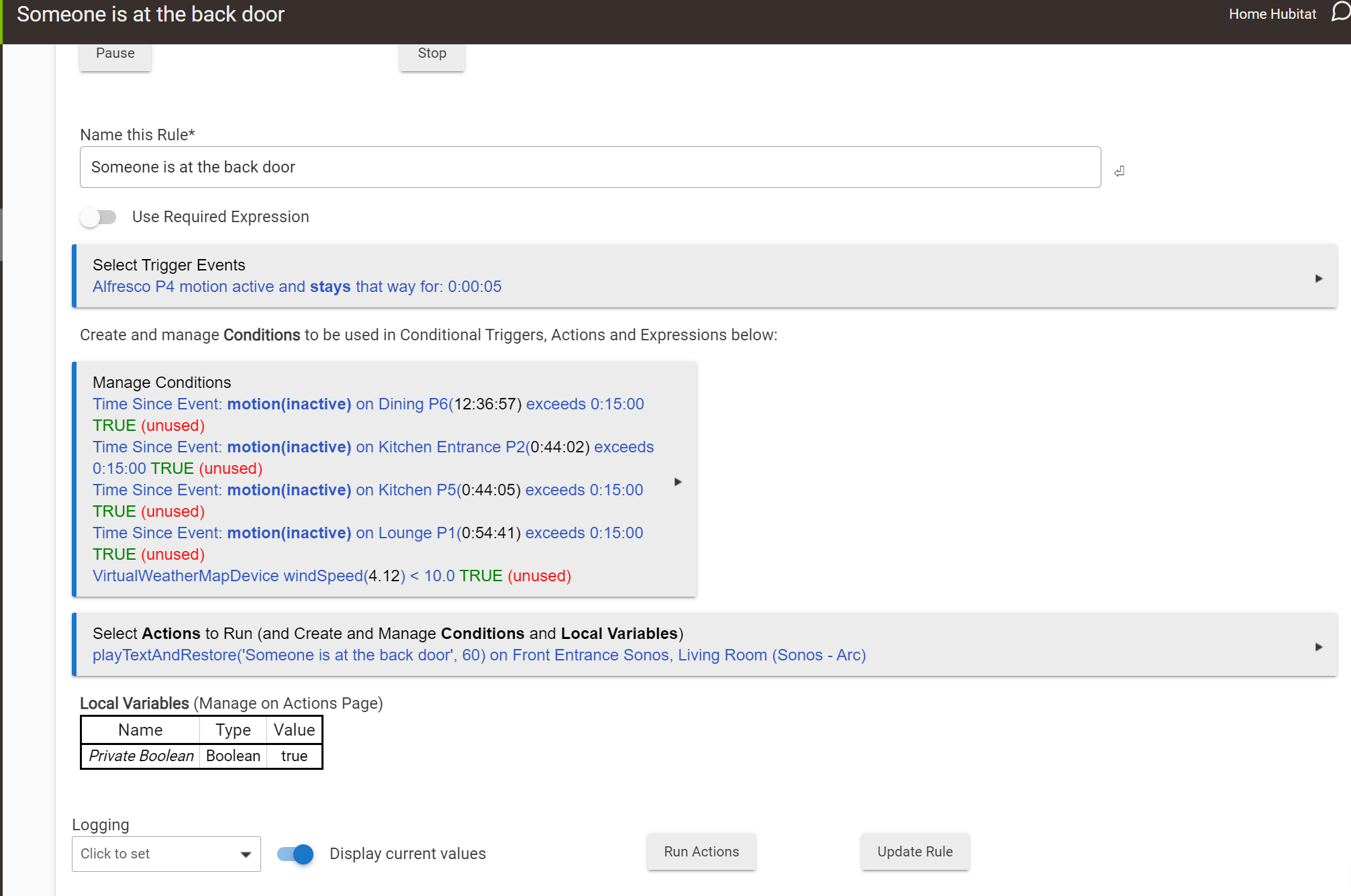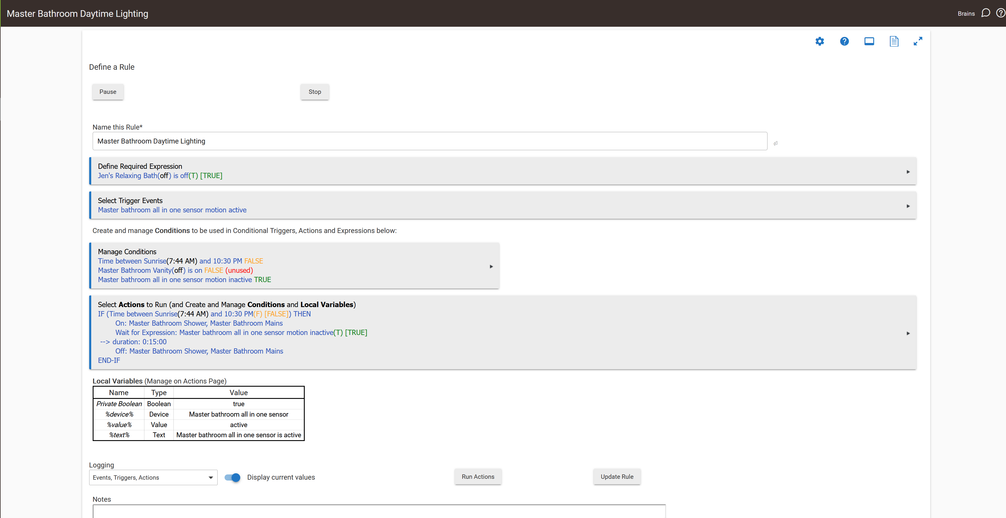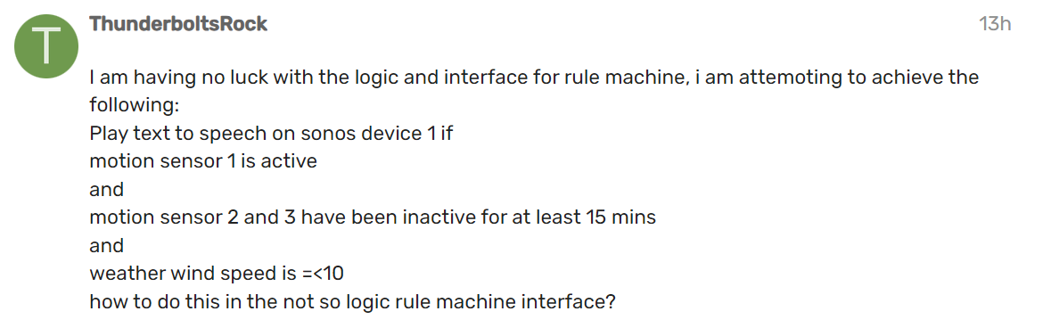 - An explanation of the rule you are trying to construct, separate to the triggers and actions configured in RM