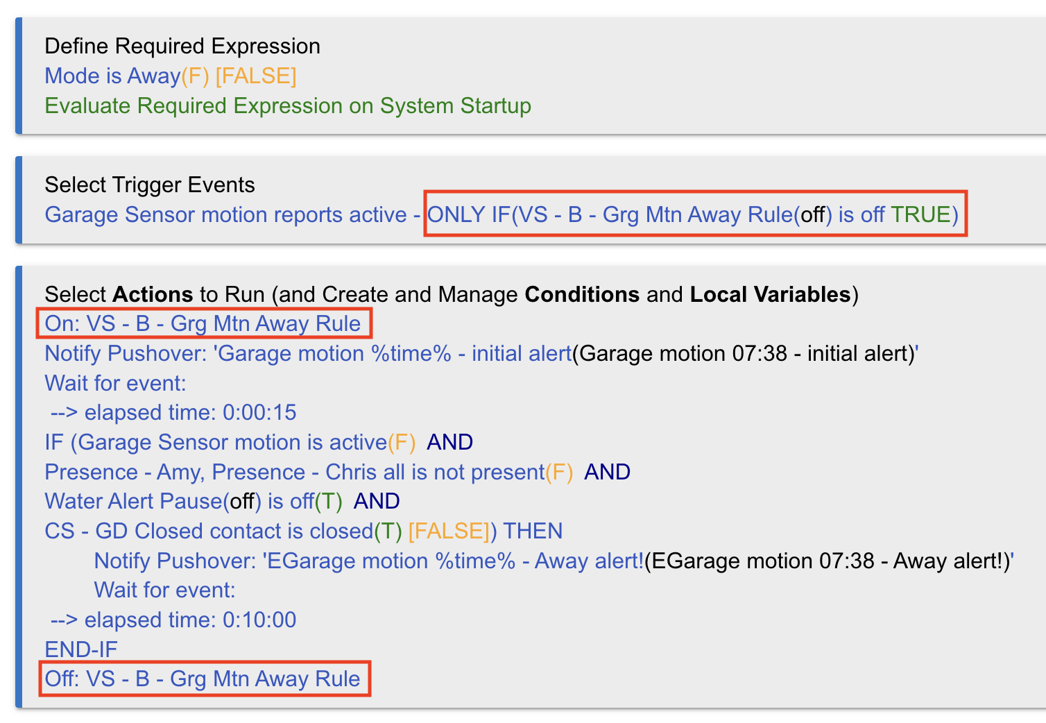 Triggers that can happen either in high volume or rapid/sustained back-to-back "bursts" (like motion active) can result in a rule getting re-fired over & over, so like many folks here, I'm keen to rein that sort of thing in.