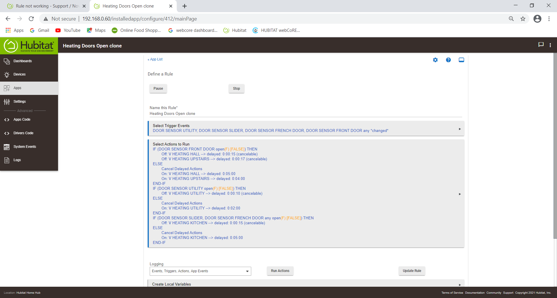 Hi, I had this rule working (I think) where when my door opened it then turned my heating off after 15 seconds in the hallway and off after 17 seconds upstairs. When the door closed it then turned the heating back on after 5±4 minutes. It doesn't seem to be working now. Can anyone help, is it possible that it never worked and I didn't notice? Any help appreciated guys