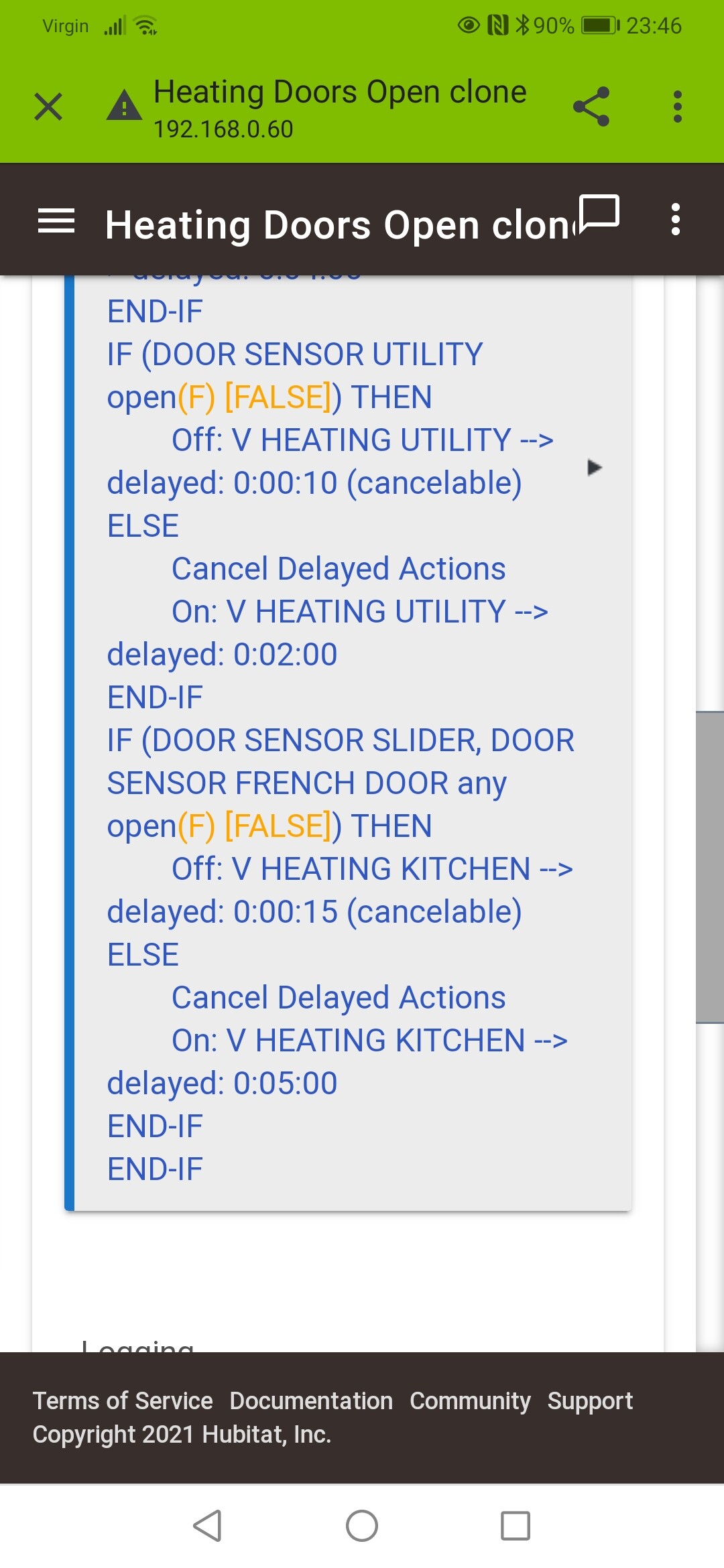 @stueyhughes I'm still seeing something concerning. If you open the front door you will schedule an off for Heating Hall and Heating Upstairs but you will also schedule an on for Heating Utility and Heating Kitchen. When the front door closes you will schedule and on for Heating Hall and Heating Upstairs and you will schedule another on for Heating Utility and Heating Kitchen. Having multiple on scheduled isn't an issue but you could run into a case where you think the system should be off but it turns back on. Again, I would recommend three rules to control these independently and use CDA to cover a door being reopened before the delay is finished.