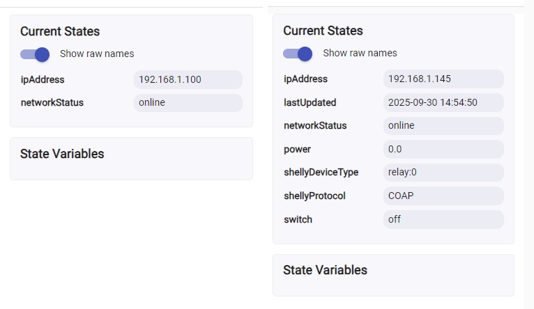 The left side means device is found but the information isn't coming through the usual channels. Interestingly enough, there's no "shellyProtocol" state, which means integration doesn't know how to talk to the device.