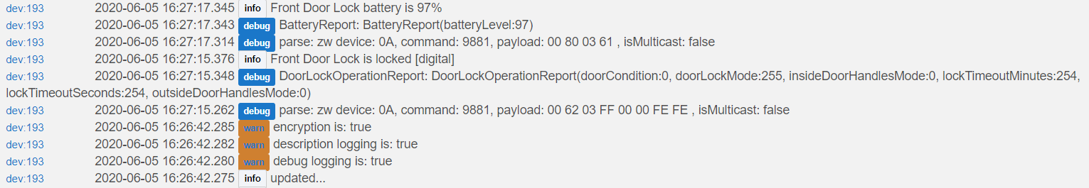 Notice that there is no "manual turn" to lock/unlock.. i just tried to unlock my door manually, and the driver did not show the "lock" status as unlocked. However, when i "refreshed" the driver it changed to unlocked and sent the trigger. Below is the additional section of the log. i have included the previous last log record to show continuity between the screen shots.