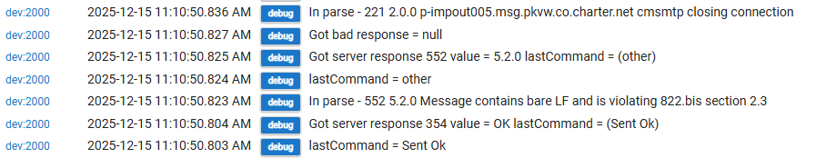 I'll post further in the Device Activity Check thread, but it could be the case that there's no interest in fixing it there since a bare LF doesn't cause an issue to other notification devices. Would it not be a simple fix to just not send a blank line since we know that to be an RFC violation?