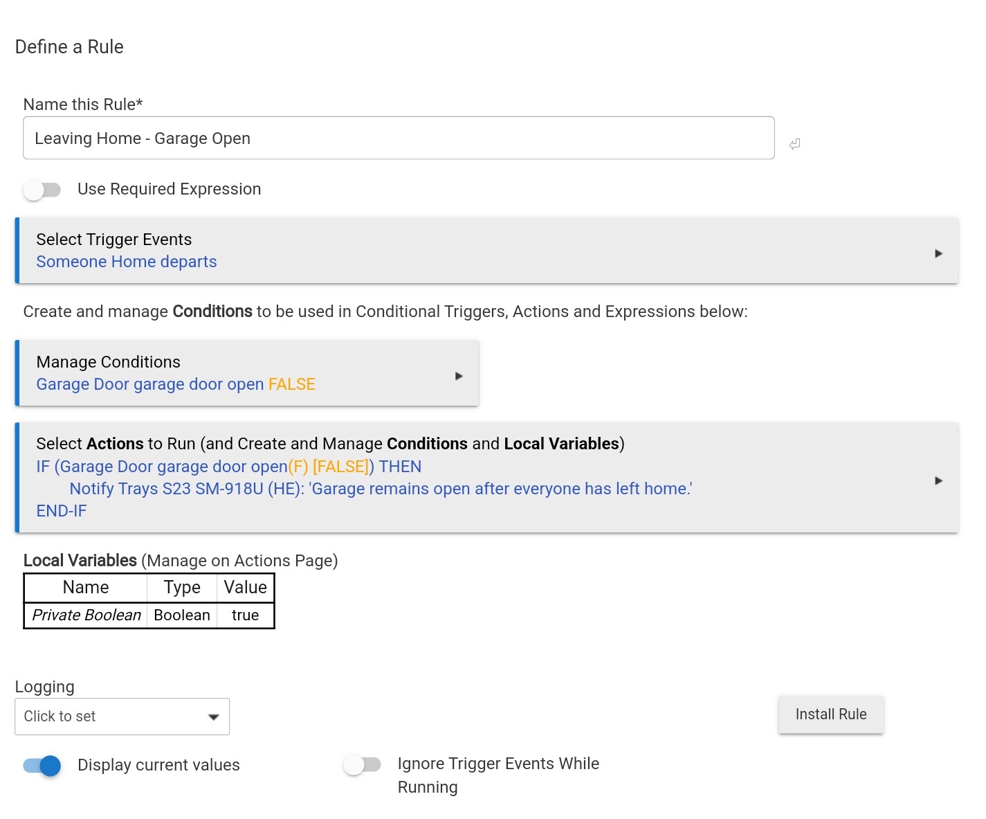 I left my house the other day and forgot to close the garage door. I would like to prevent this from happening again. I have geofence setup. Moved the point to my house on the map. I need help setting up a rule to close the garage door if it's not already closed when I leave the house.