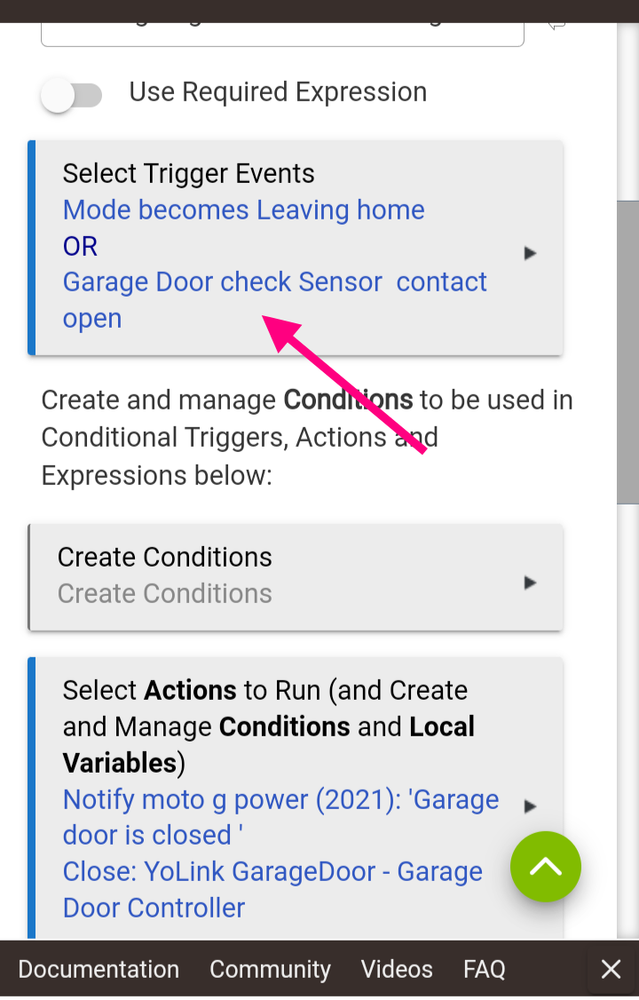 Are you referring to the mobile app on your phone? Earlier I was talking about configuring a rule on the HE hub in an App such as Rule Machine or something similar. Is that what you are also trying to do?