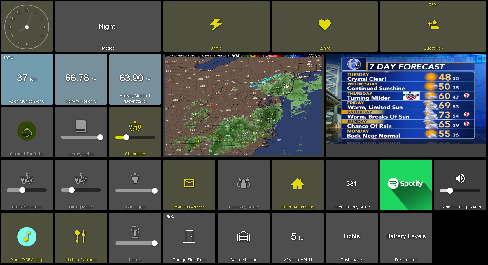 I put this together today. This is actually the third or fourth different version I've done since 2.0 came out. I feel like this is the best one I've done so far, but I'm still exploring different layouts and navigation paradigms. I'm running this dashboard on a Fire HD 10 mounted on a wall over a recessed USB outlet that I installed specifically for this purpose.