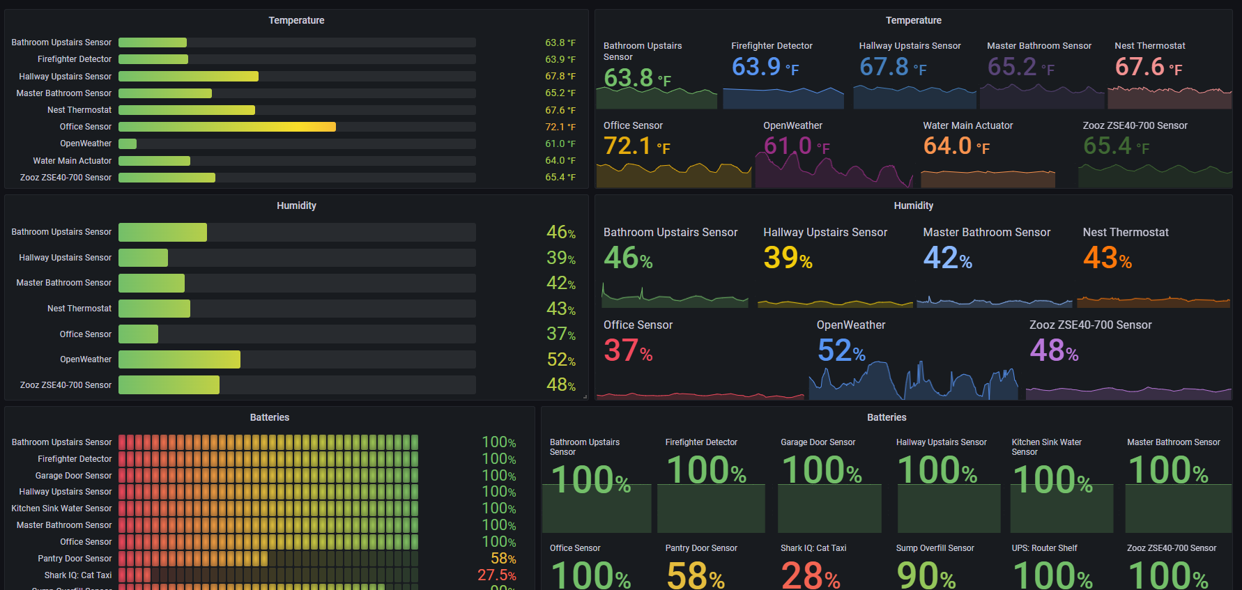 Just updated my main sensors dashboard yesterday. I was getting so much data from multiple sensors the line chart turned into a big mess. I kept the line charts below so I can see trends if I want but now I can see current conditions at a glance.
