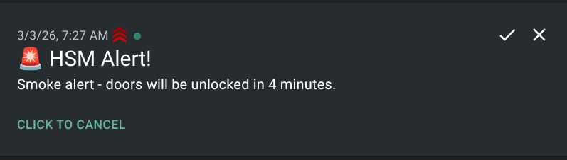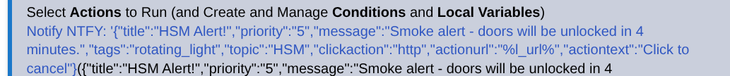The next rule requires smart locks and smoke detectors connected to the hub. If a smoke detector goes active, multiple high priority notifications will go out to me and my wife alerting us that all the doors will be unlocked in 4 minutes. If the action isn't cancelled, the locks are unlocked after that delay. I have a second rule that is triggered by a cloud URL that will cancel first rule's delayed actions. I send the cloud URL in one of the notifications so I can abort the unlock. I decided this was a good idea after seeing what the fire department did to my neighbor's front door when they had a fire.