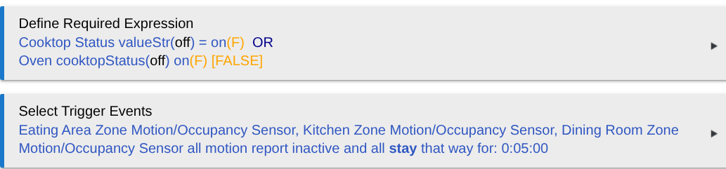 In my rule I use the cooktop status from HA and the "Oven cooktopStatus" from HE as my required expressions, then use the inactive motion detectors as the trigger. The three motion sensors are three zones of a single Aqara FP2.
