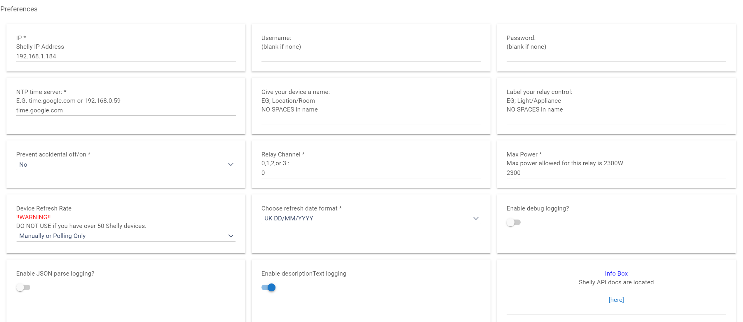 - Enter valid settings for any field marked with an asterisk. For example: Shelly As A Switch, for use with a Shelly 2.5 relay. Enter valid values for IP address and Relay Channel (choices will be o or 1 for the Shelly 2.5). Note: For the Shelly 2.5, you will set up a second instance of the device handler for the second relay channel.