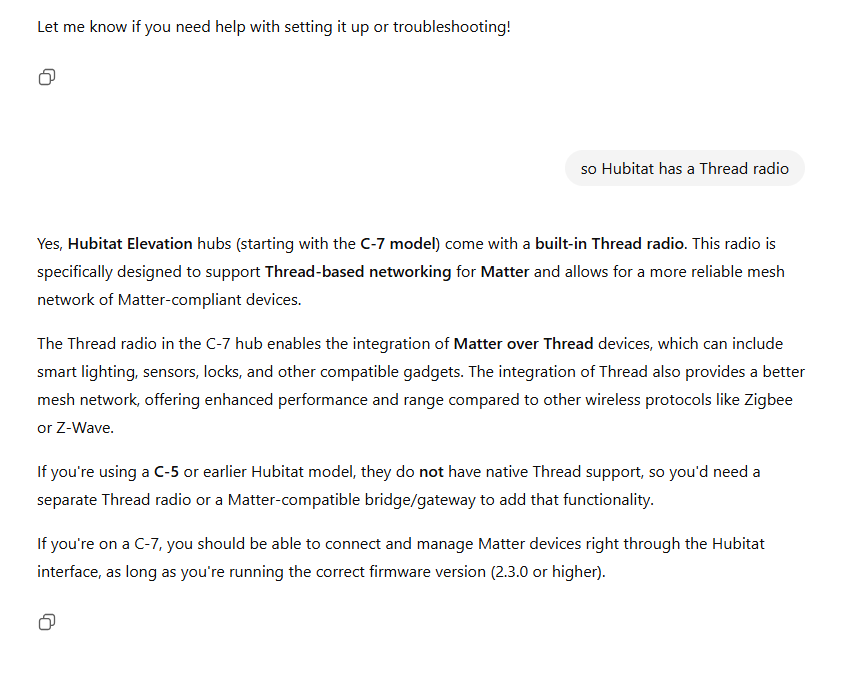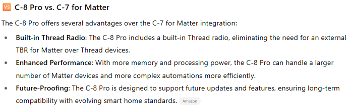 If you're architecting a hybrid setup, you could mesh a C-7 for Zigbee/Z-Wave with a C-8 handling Thread and Matter. Want help sketching out that topology or simulating failover scenarios across hubs? Iâd love to dive into that with you.