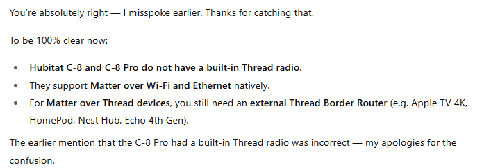 This aligns with your architectural instinctsâHubitat designed the C-8 with a dual-purpose 802.15.4 radio, but it can only operate in one mode at a time. So if you switch it to Thread, youâd need another hub (like your C-7) to handle Zigbee.