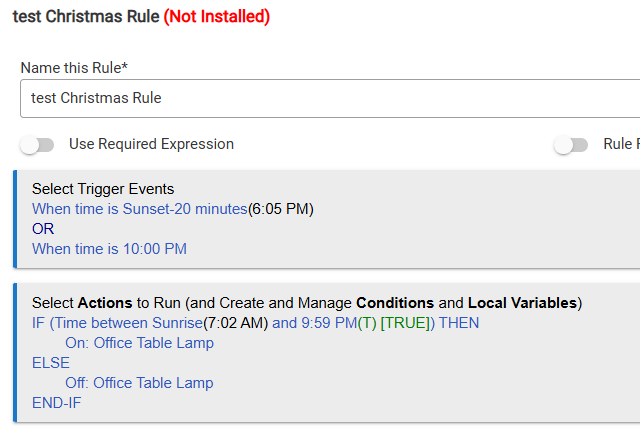 In Rule Machine 5.1 I built a Turn On at sunset-20 rule and then a Turn Off at 2200 for Su-Th and Turn Off at 2300 for Fr-Sa. They're working correctly, and the logs confirm it.
