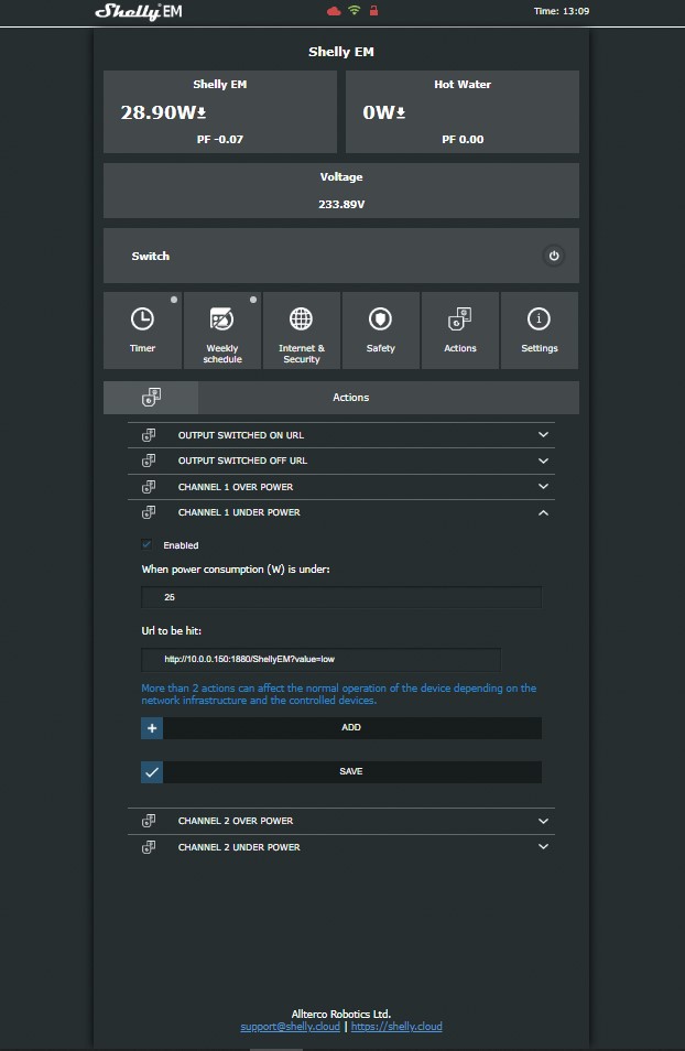 - Shelly EM version 1 - Underpower URL is set so when load is below 25 Watts the