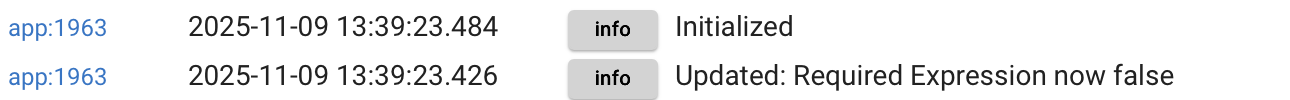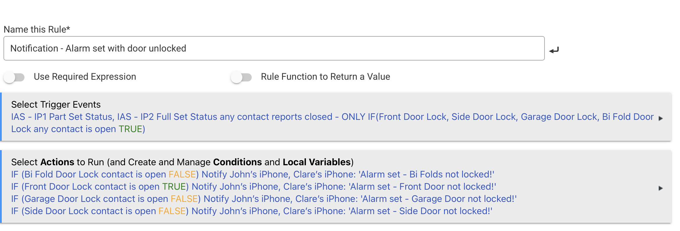 As you can see above the conditional trigger evaluates True so I expect it to trigger. The simple conditional for the Front Door being unlocked also evaluates True. If I go into the rule and click 'Done' I see two entries - 'Initialized' as I'd expect but 'Updated: Required expression now false' which is unexpected, as it is True: