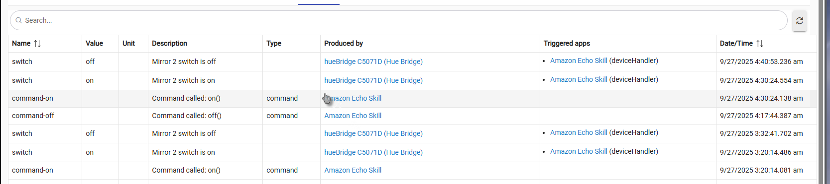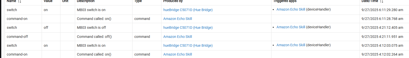 My Hubitat C-8 has been having issues with the Amazon Echo skill turning on hue lights randomly throughout the night. There are no calls to turn-on the lights in Alexa logs in the Alexa app being made, there are no routines, hunches are disabled, I am not running guard mode either. I have disabled ultrasound on devices that have it. I have removed and readded the Alexa skill. I have removed and readded coco hue integration and the built in integration to see if that would stop the issue. I am running the beta version of Hubitat as I am using the hue pro hub now. I am at my wits end on this and ready to chuck Hubitat out a window. I also use Alexa+ and haven't had this issue before, but it has been present since I upgraded to the beta to use the Hue Pro Hub. I also am including the logs of a recent light turning itself on overnight. It states the Amazon Echo Skill. Is there anything I should be looking for or doing?