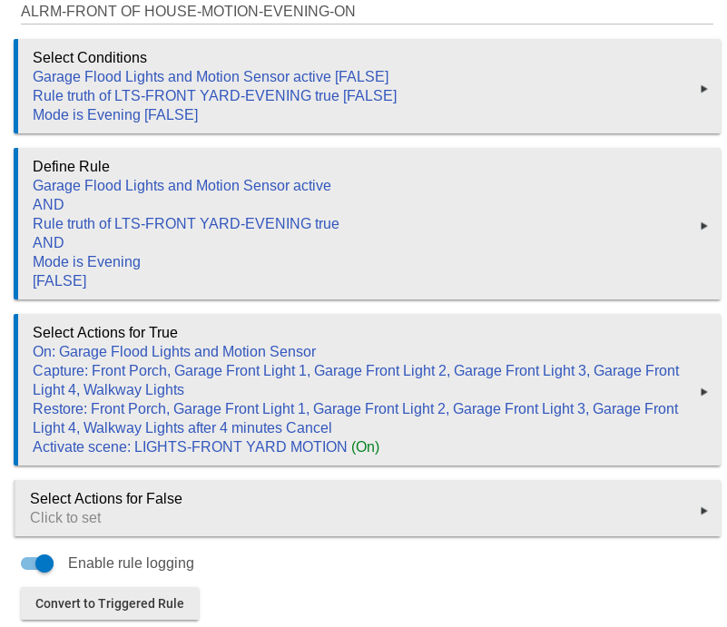 I have lights across the front of my garage. I have them come on during an evening mode. That's the rule of truth you see. So in this case I only want to do these actions when.