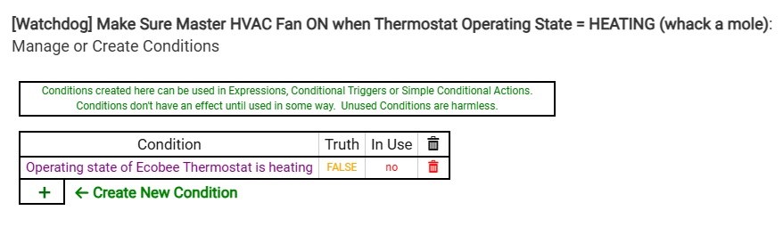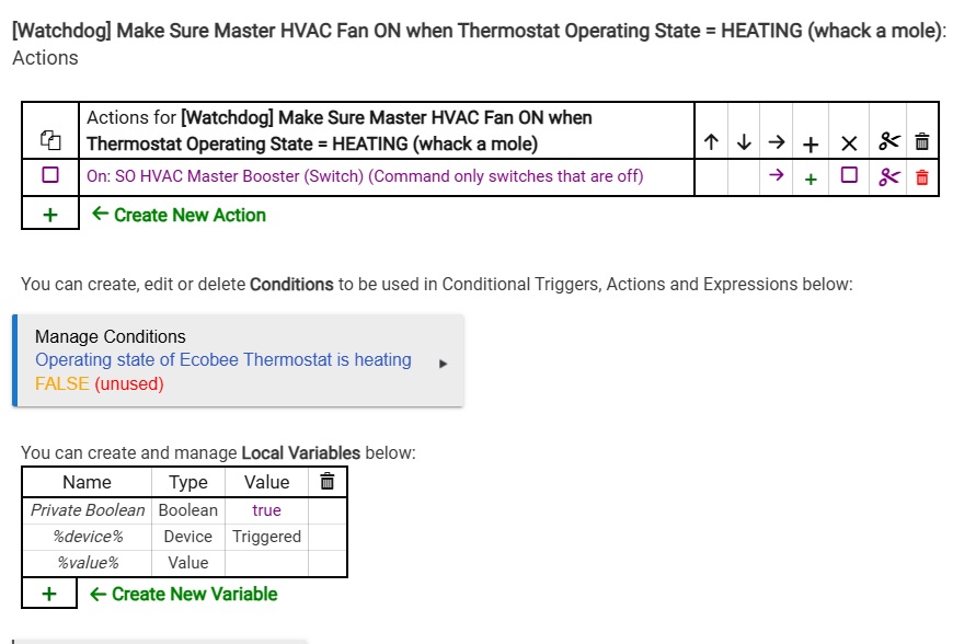 These rules have been operating fine for months. For some reason, these CONDITIONAL logic for these rules are now failing. Although the thermostat is idle, I'm continually seeing both these rules ACTIONs executing every minute even though the log clearly shows thermostatOperatingState remaining idle.